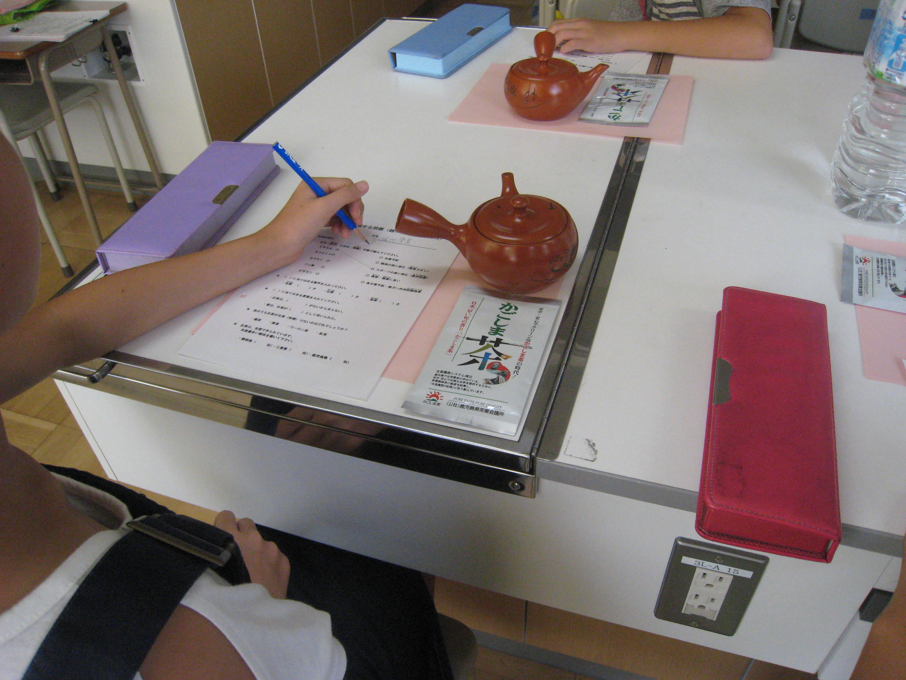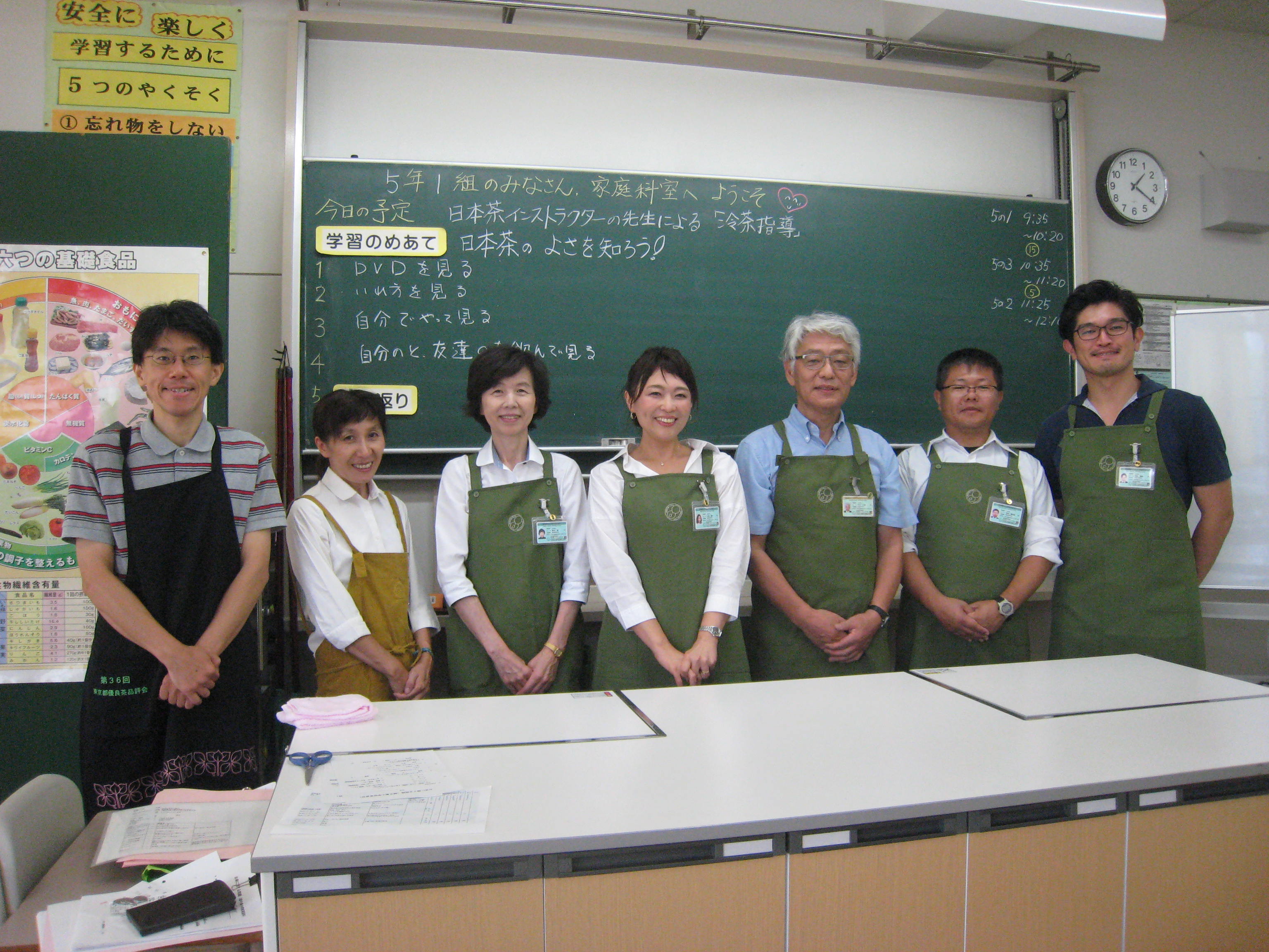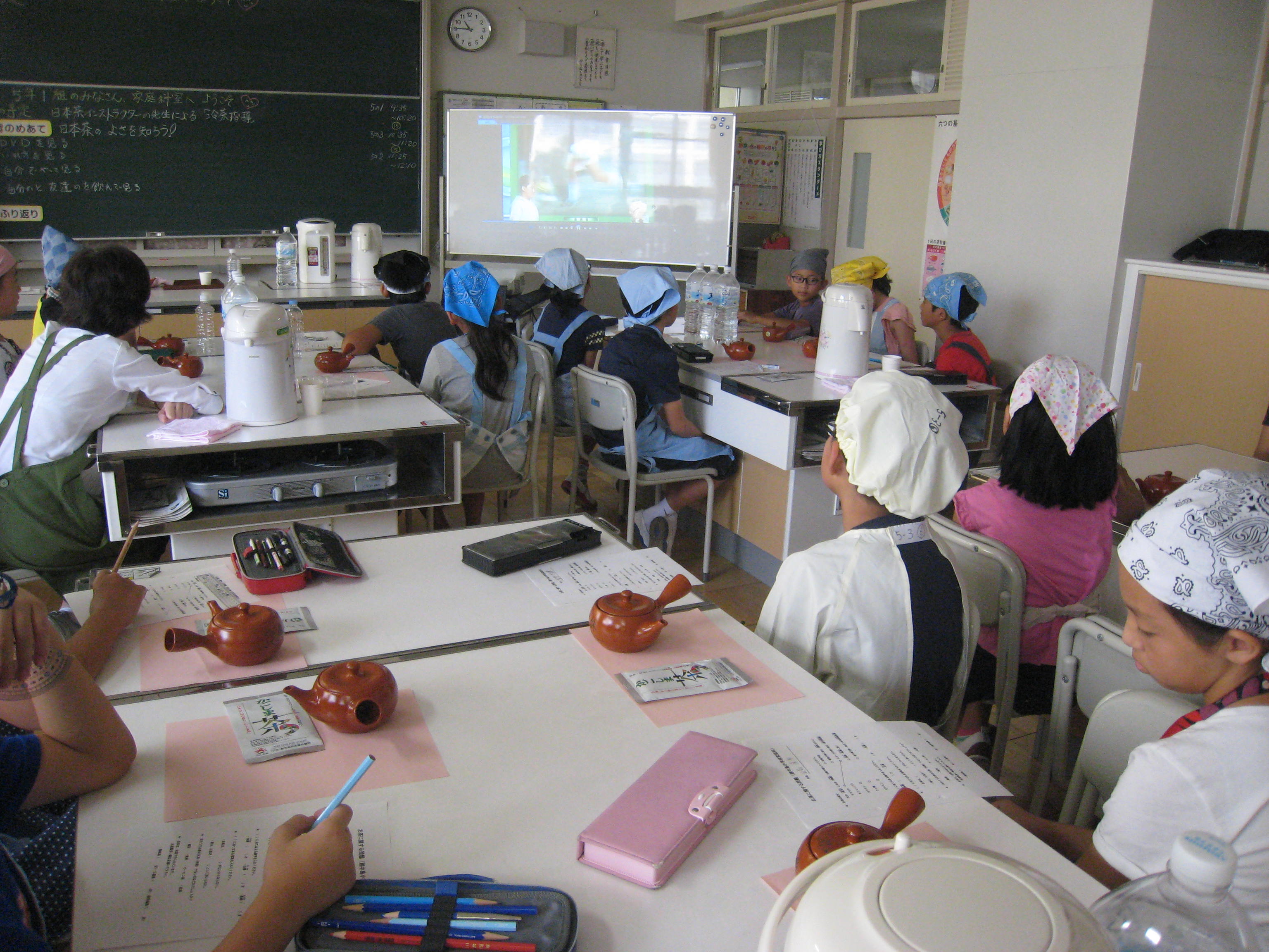 掲載日:2017-09-23 江東区立越中島小学校5年食育授業 2017/08/28 昨年に引き続き「マイペット茶を作ろう!」の授業を5年生3クラス(98名)で実施しました。千差万別のペット茶が出来上がり味や水色の違いに驚きながら和気藹々に授業が出来ました。 (文責:今井久雄) 板書 DVDで学ぶ クイズに挑戦 実習① 実習② スタッフ一同