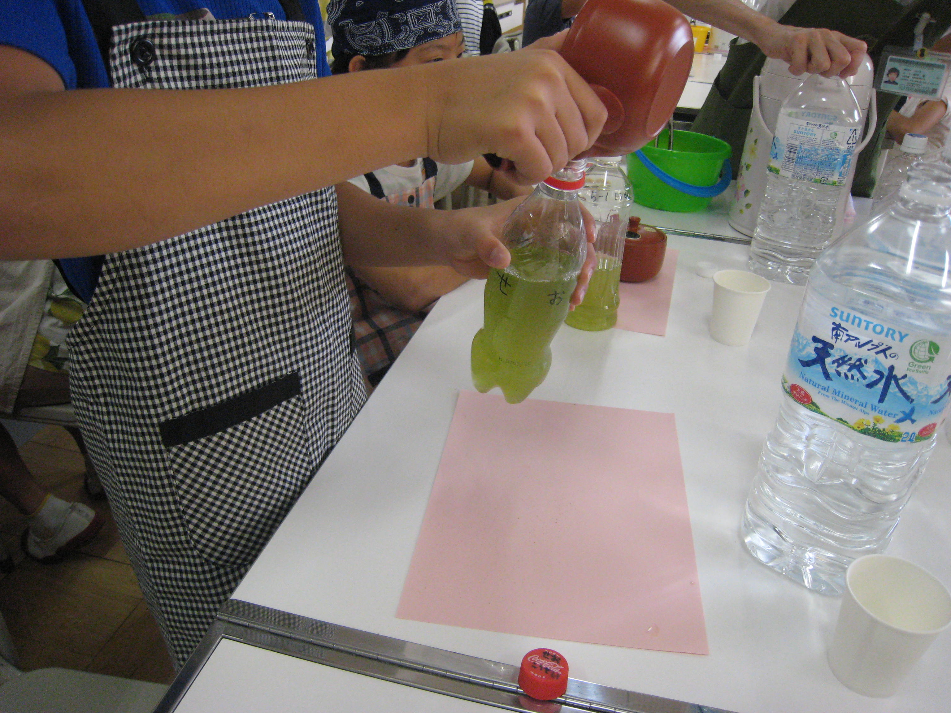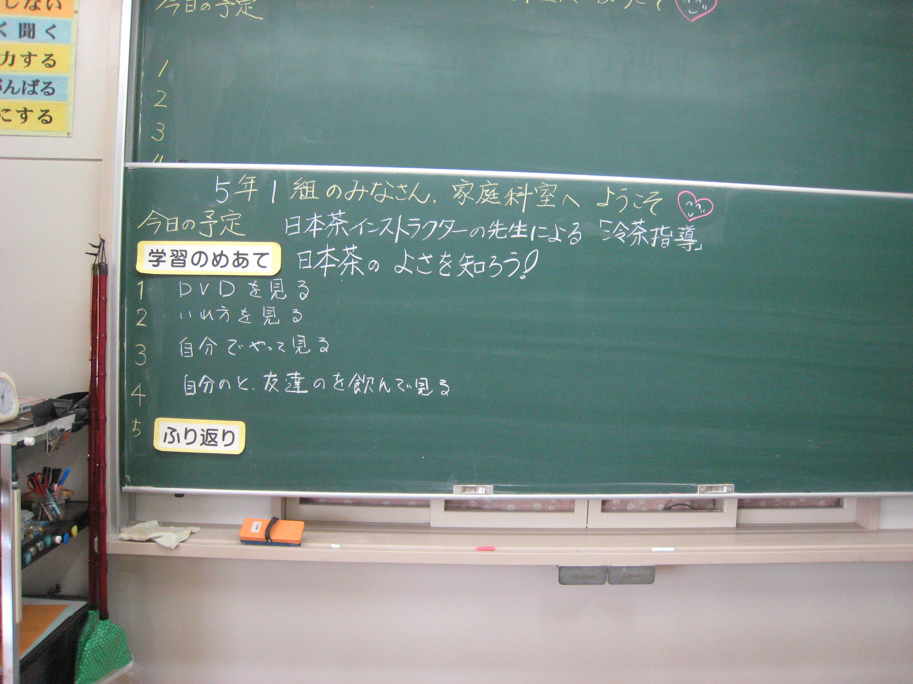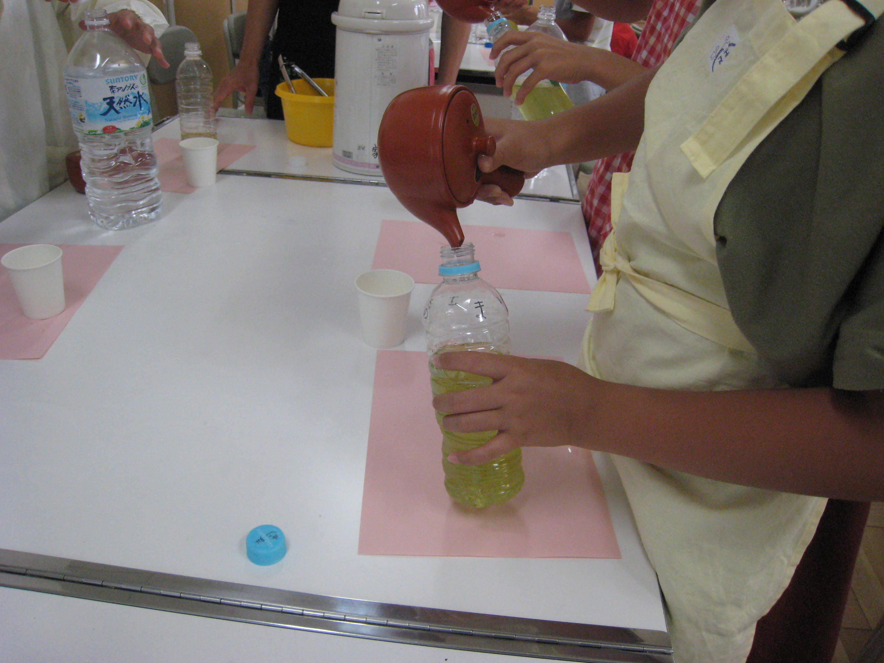 掲載日:2017-09-23 江東区立越中島小学校5年食育授業 2017/08/28 昨年に引き続き「マイペット茶を作ろう!」の授業を5年生3クラス(98名)で実施しました。千差万別のペット茶が出来上がり味や水色の違いに驚きながら和気藹々に授業が出来ました。 (文責:今井久雄) 板書 DVDで学ぶ クイズに挑戦 実習① 実習② スタッフ一同