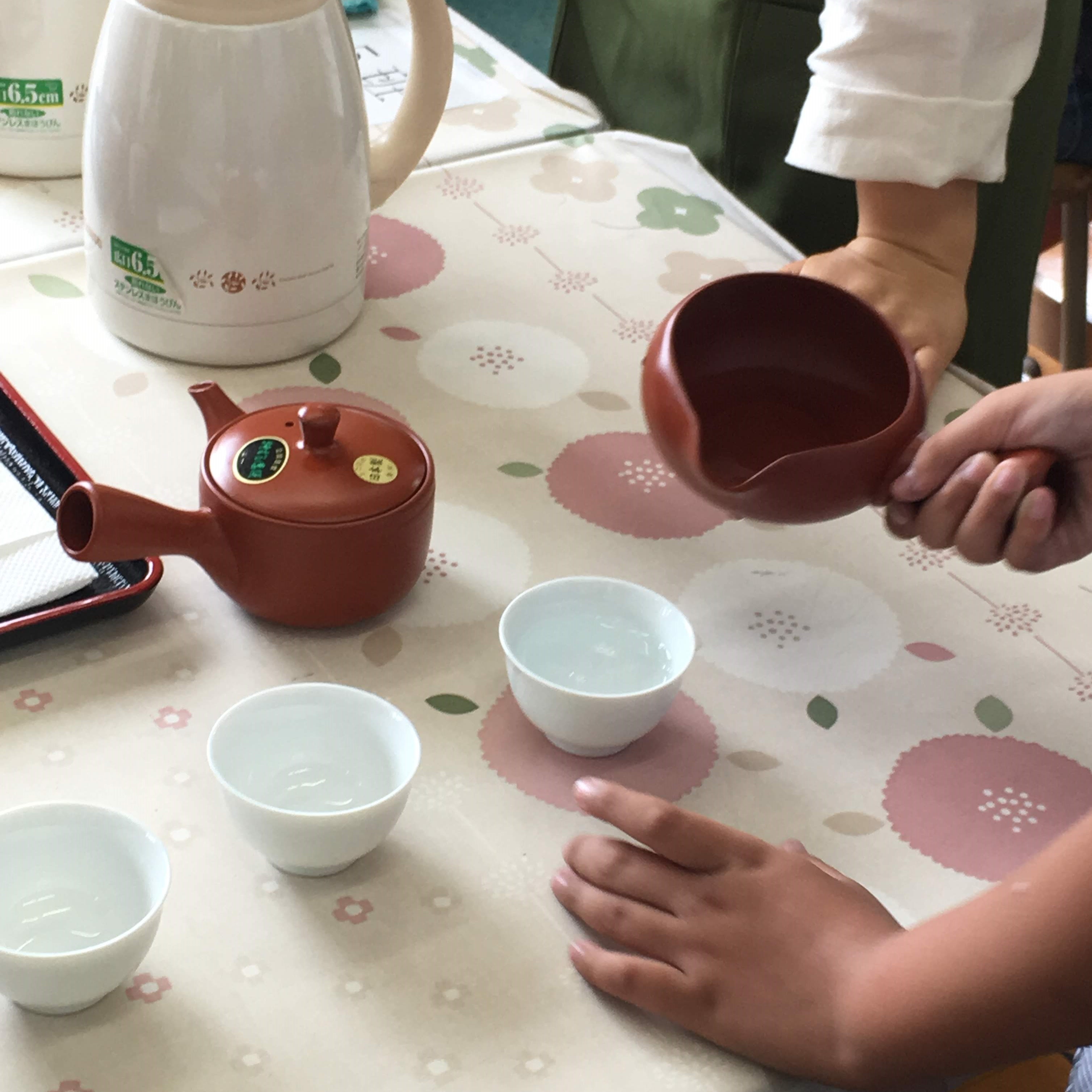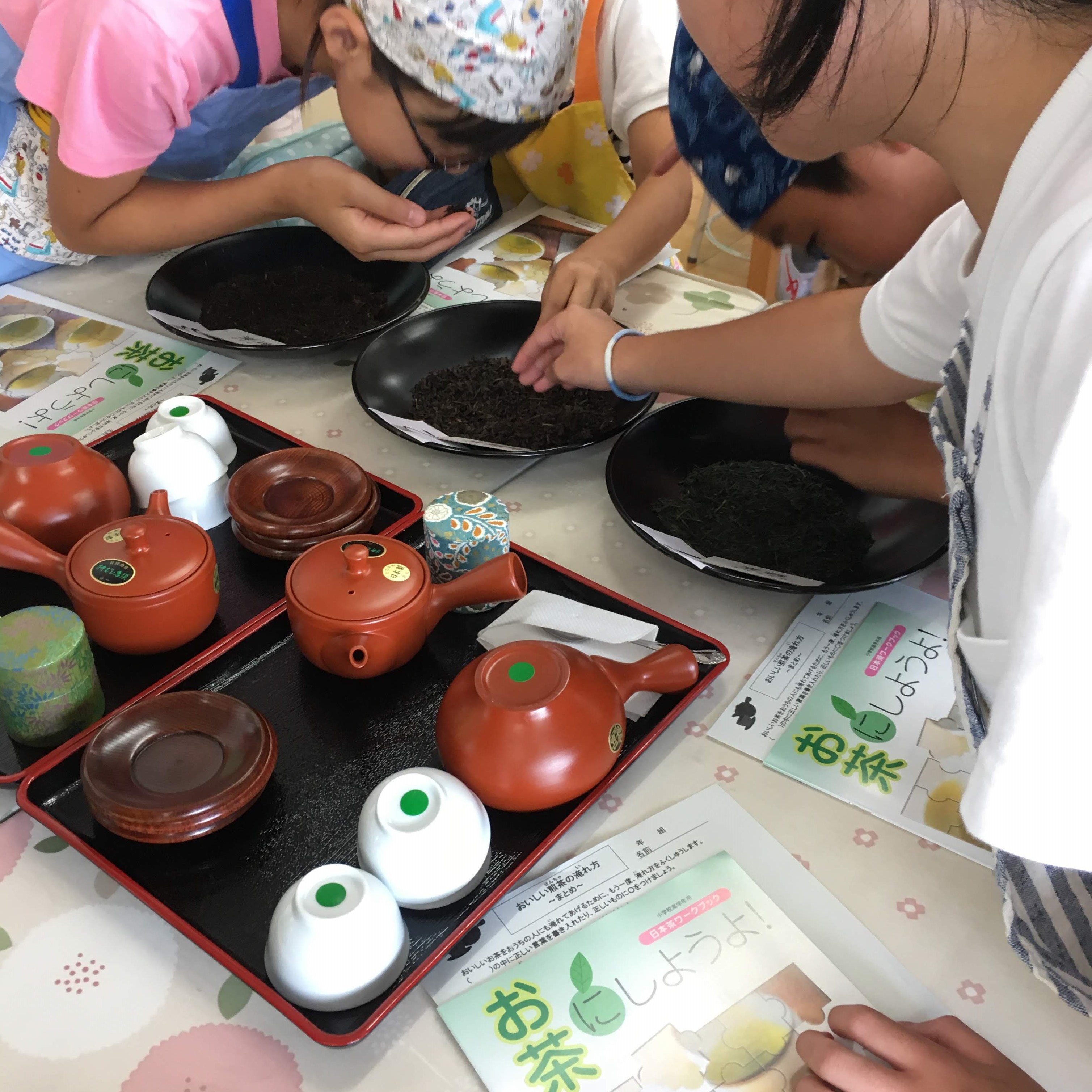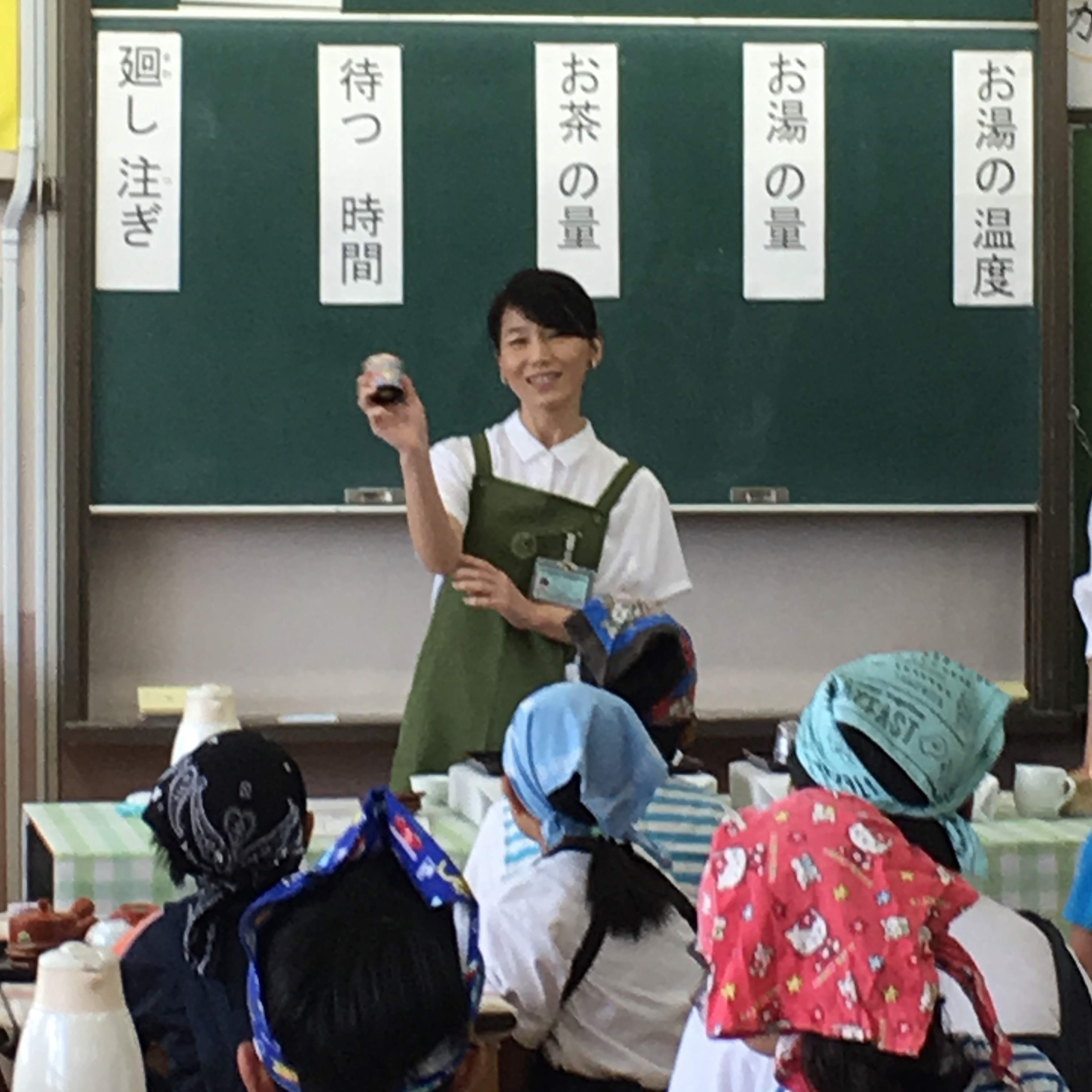 今年で4年目となる学校の授業でした。児童たちは皆素直でかわいらしく、楽しくお茶の授業に臨んでくれました。緑茶、烏龍茶、紅茶の製造方法の違う3種を当てるミニゲームの時は、各班ごとに白熱した時間となりました。担任教諭や家庭科教諭もお茶の淹れ方実習に参加し、児童と共に楽しんでくださいました。