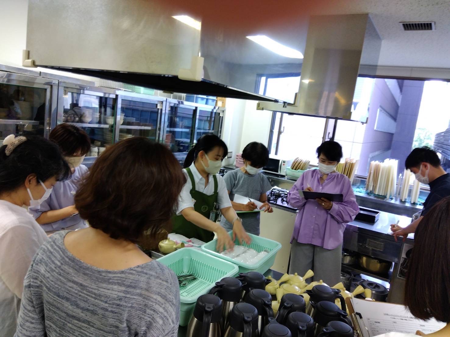 BASICでは受講生が2つのグループに分かれ、茶道具が入ったスーツケースの開梱作業をし、茶道具の数の確認と洗浄の際の対応、梱包作業までを行いました。お茶の淹れ方研修ではお手本インストラクションの後、4人グループに分かれて演習、湯のみに注がれた茶を残りのメンバーで飲みました。