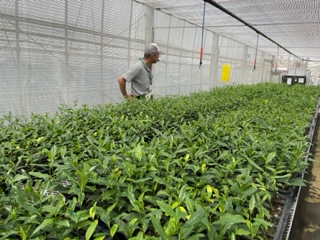 午前・・・茶研で育苗を担当する茶業技術研究担当部長の高橋淳さんに、茶畑と製茶工場を案内していただきました。交配し袋がけした茶樹や選別して育てている小さな苗などを実際に見て、育苗をスタートから解説していただきました。続いて、碾茶も製造できる工場を見学しました。