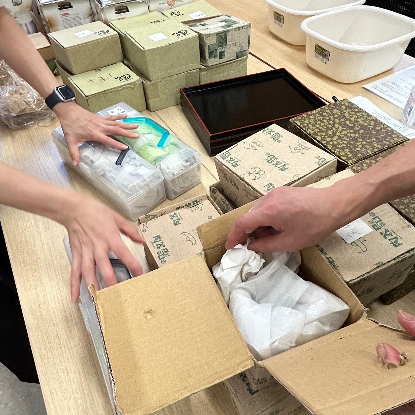前半は、茶道具が入っている専用スーツケースからの開梱作業をしながら、たくさんの茶道具の扱い方、お盆へのセッティング方法、活動時に注意すべきポイントなどを体感しました。
